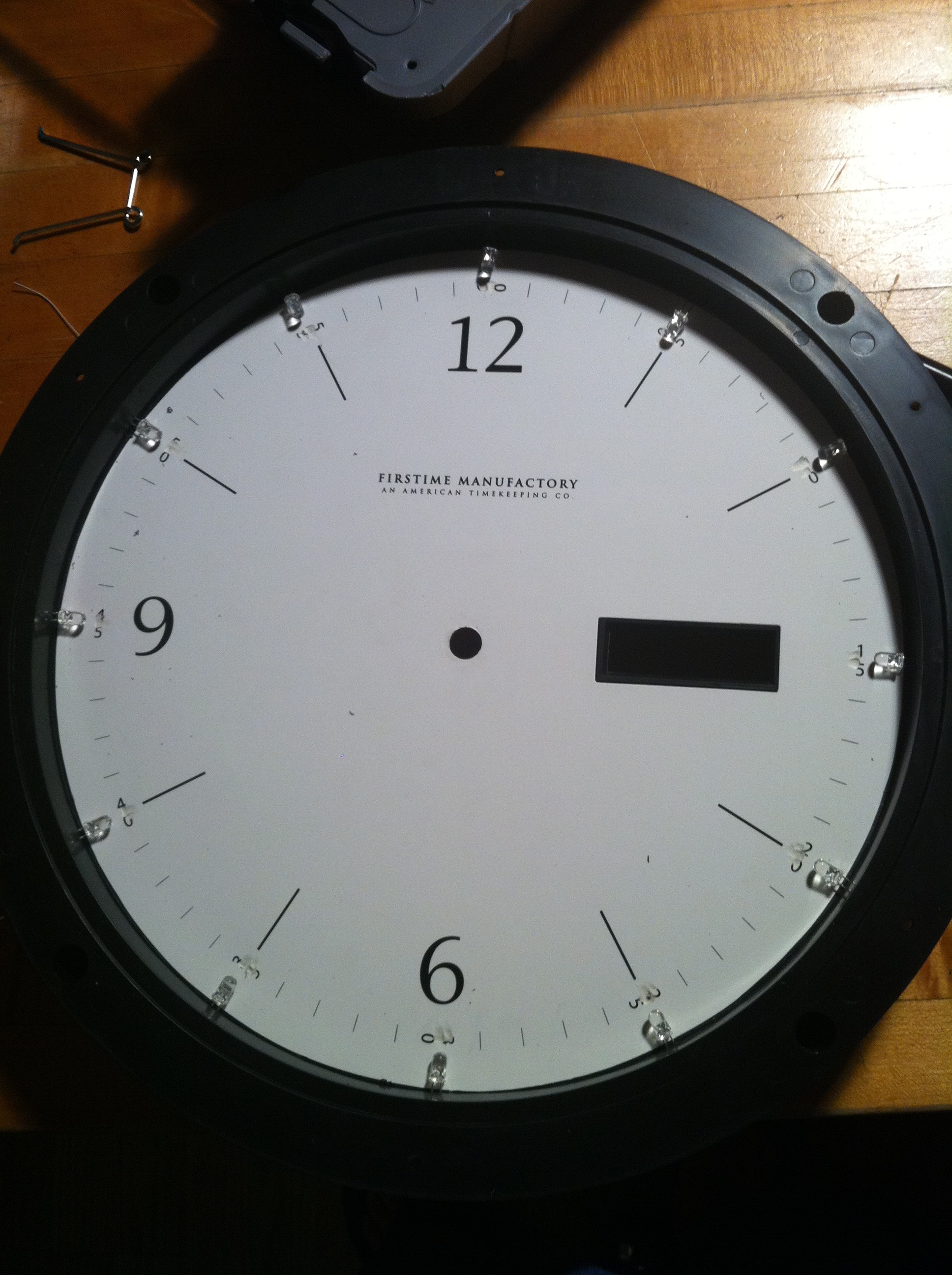 After removing the metal outer layer, I looked for good places to put the LEDs. I figured each LED should represent an hour, so I drilled two holes for each LED leg above each number on the clock face.